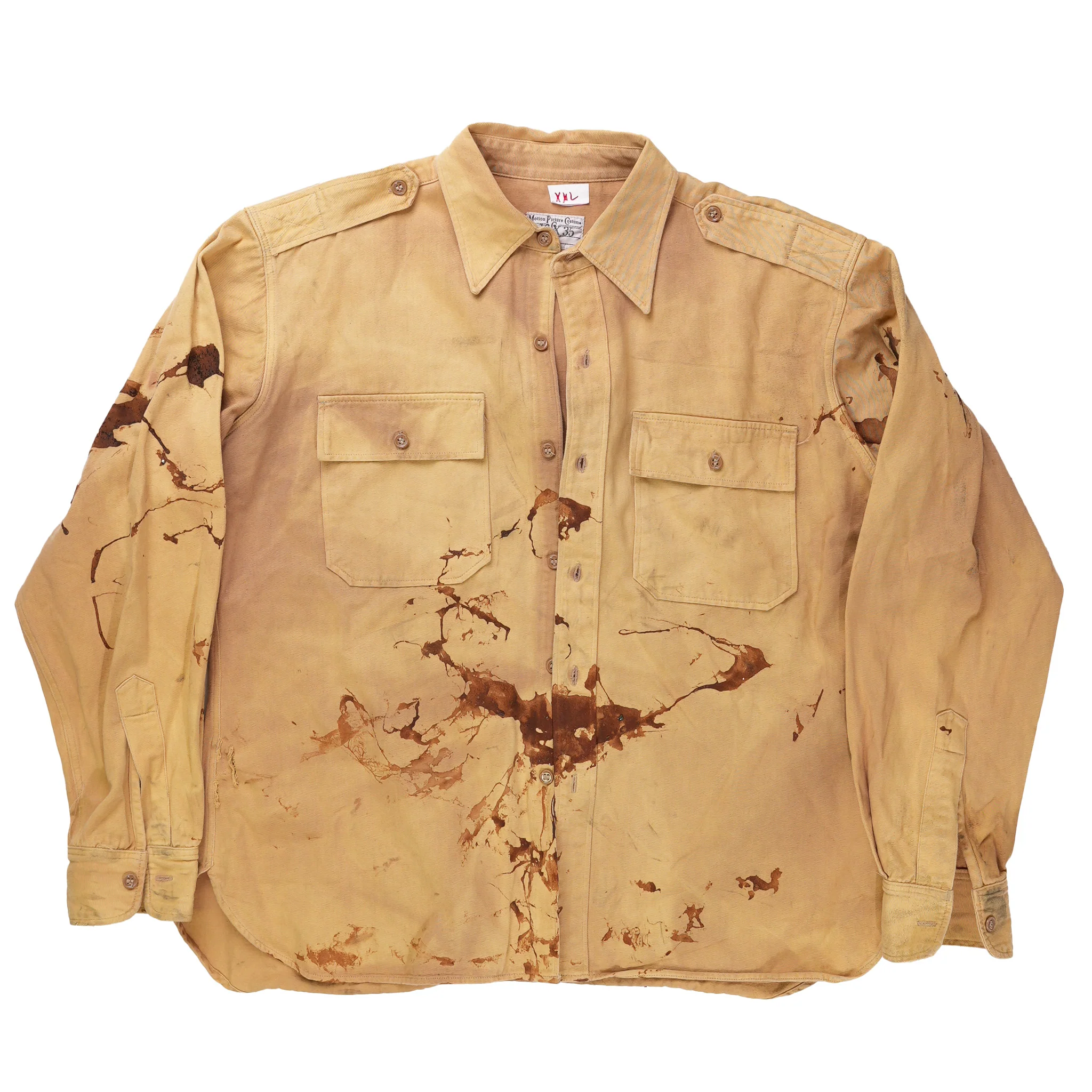 Embrace the crucible of grim industry with these used prop shirts. Designed to imitate iconic WW2 era O.D. flannel shirts, these have been artificially dirtied to look greasy and even bloody. These pieces are perfect for everything from LARP to the total alienation of labor and meaning. We've all read the script, so why not look the part?